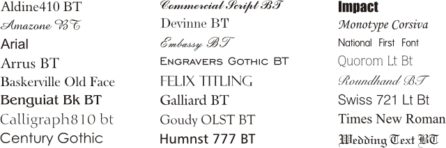 You can choose from the following 24 fonts. From our experience these all of these fonts engrave very well on both plaques and acrylics. We regret, but we are unable to substitute with other fonts.